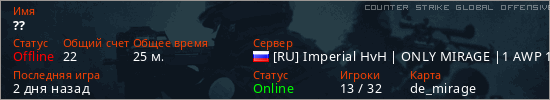 Играет на Counter Strike Global Offensive сервере. Страна: РоссияПервый раз замечен 08:35 08.08.2025