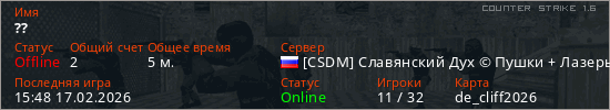 Играет на Counter Strike 1.6 сервере. Страна: РоссияПервый раз замечен 15:44 17.02.2026
