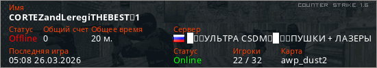 Играет на Counter Strike 1.6 сервере. Страна: РоссияПервый раз замечен 11:08 04.02.2026