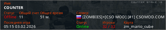 Играет на Counter Strike 1.6 сервере. Страна: РоссияПервый раз замечен 23:14 29.01.2026