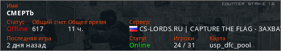 Играет на Counter Strike 1.6 сервере. Страна: РоссияПервый раз замечен 23:31 15.07.2021