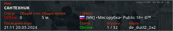 Играет на Counter Strike 1.6 сервере. Страна: РоссияПервый раз замечен 21:09 20.05.2024