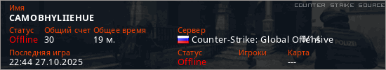 Играет на Counter Strike Source сервере. Страна: РоссияПервый раз замечен 14:57 27.10.2025