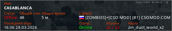 Играет на Counter Strike 1.6 сервере. Страна: РоссияПервый раз замечен 16:34 28.03.2026