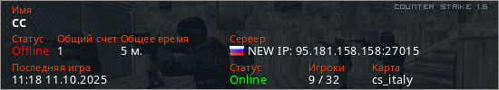 Играет на Counter Strike 1.6 сервере. Страна: РоссияПервый раз замечен 11:16 11.10.2025