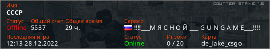 Играет на Counter Strike 1.6 сервере. Страна: РоссияПервый раз замечен 17:35 08.03.2022
