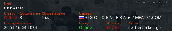Играет на Counter Strike 1.6 сервере. Страна: РоссияПервый раз замечен 20:49 16.04.2024