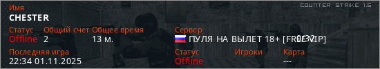 Играет на Counter Strike 1.6 сервере. Страна: РоссияПервый раз замечен 11:00 26.08.2025