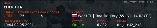 Играет на Counter Strike 1.6 сервере. Страна: РоссияПервый раз замечен 01:54 07.02.2021