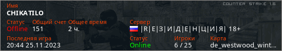 Последний раз был в сети 20:44 25.11.2023 Игрок с таким ником замечен на 12 серверах