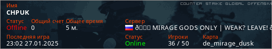 Играет на Counter Strike Global Offensive сервере. Страна: РоссияПервый раз замечен 22:35 27.01.2025