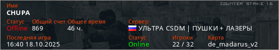 Играет на Counter Strike 1.6 сервере. Страна: РоссияПервый раз замечен 22:08 23.10.2024