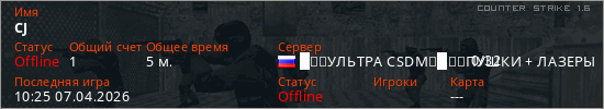 Играет на Counter Strike 1.6 сервере. Страна: РоссияПервый раз замечен 10:05 07.04.2026