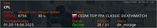 Играет на Counter Strike 1.6 сервере. Страна: РоссияПервый раз замечен 20:53 25.12.2019