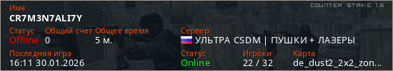 Играет на Counter Strike 1.6 сервере. Страна: РоссияПервый раз замечен 15:44 30.01.2026