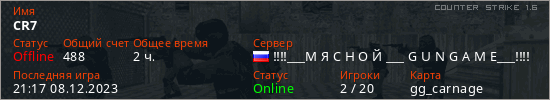 Играет на Counter Strike 1.6 сервере. Страна: РоссияПервый раз замечен 14:11 24.12.2022