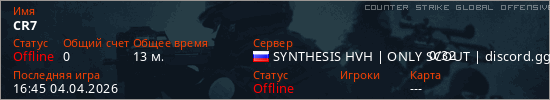 Играет на Counter Strike Global Offensive сервере. Страна: РоссияПервый раз замечен 08:41 23.03.2026