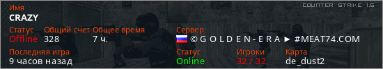 Играет на Counter Strike 1.6 сервере. Страна: РоссияПервый раз замечен 19:15 10.06.2023