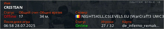 Играет на Counter Strike 1.6 сервере. Страна: РумынияПервый раз замечен 06:57 15.09.2024