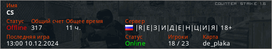 Играет на Counter Strike 1.6 сервере. Страна: РоссияПервый раз замечен 09:43 02.02.2019