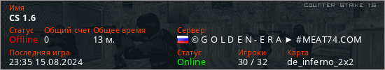 Играет на Counter Strike 1.6 сервере. Страна: РоссияПервый раз замечен 19:54 24.10.2023
