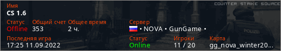 Играет на Counter Strike Source сервере. Страна: РоссияПервый раз замечен 14:18 07.09.2022