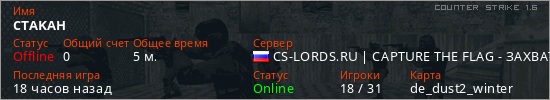 Играет на Counter Strike 1.6 сервере. Страна: РоссияПервый раз замечен 19:15 15.12.2025