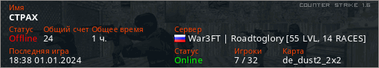 Последний раз был в сети 18:38 01.01.2024 Игрок с таким ником замечен на 23 серверах