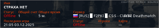 Играет на Counter Strike Source сервере. Страна: РоссияПервый раз замечен 19:34 03.12.2025