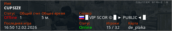 Играет на Counter Strike 1.6 сервере. Страна: РоссияПервый раз замечен 16:48 12.02.2026
