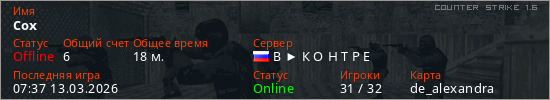 Играет на Counter Strike 1.6 сервере. Страна: РоссияПервый раз замечен 12:34 26.02.2026