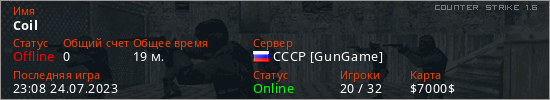 Играет на Counter Strike 1.6 сервере. Страна: РоссияПервый раз замечен 22:49 24.07.2023