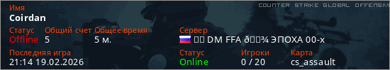 Играет на Counter Strike Global Offensive сервере. Страна: РоссияПервый раз замечен 21:04 19.02.2026