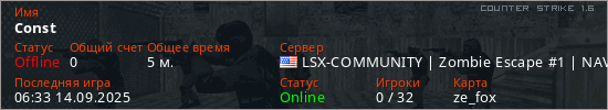 Играет на Counter Strike 1.6 сервере. Страна: СШАПервый раз замечен 06:16 14.09.2025