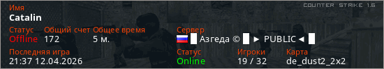 Играет на Counter Strike 1.6 сервере. Страна: РоссияПервый раз замечен 21:35 12.04.2026