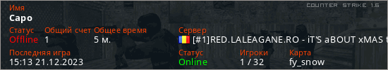 Играет на Counter Strike 1.6 сервере. Страна: РумынияПервый раз замечен 15:11 21.12.2023