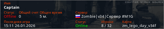 Играет на Counter Strike Source сервере. Страна: РоссияПервый раз замечен 15:07 26.01.2026