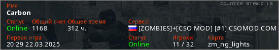 Играет на Counter Strike 1.6 сервере. Страна: РоссияПервый раз замечен 20:29 22.03.2025