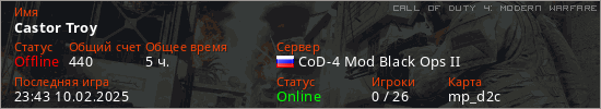 Играет на Call of Duty 4: Modern Warfare сервере. Страна: РоссияПервый раз замечен 20:18 08.11.2023