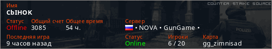 Играет на Counter Strike Source сервере. Страна: РоссияПервый раз замечен 15:17 25.04.2024
