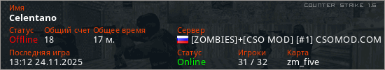 Играет на Counter Strike 1.6 сервере. Страна: РоссияПервый раз замечен 02:37 18.11.2025