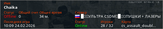 Играет на Counter Strike 1.6 сервере. Страна: РоссияПервый раз замечен 07:53 04.02.2026