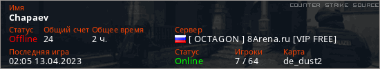 Играет на Counter Strike Source сервере. Страна: РоссияПервый раз замечен 15:27 29.04.2020