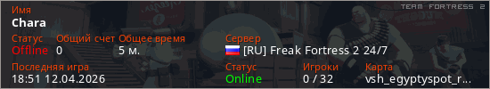Играет на Team Fortress 2 сервере. Страна: РоссияПервый раз замечен 18:49 12.04.2026