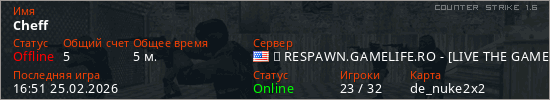 Играет на Counter Strike 1.6 сервере. Страна: СШАПервый раз замечен 16:19 25.02.2026
