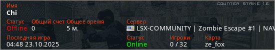 Играет на Counter Strike 1.6 сервере. Страна: СШАПервый раз замечен 04:42 23.10.2025