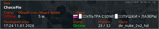 Играет на Counter Strike 1.6 сервере. Страна: РоссияПервый раз замечен 17:22 11.01.2026