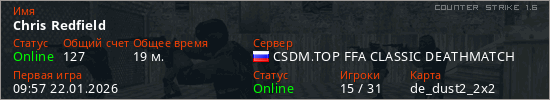 Играет на Counter Strike 1.6 сервере. Страна: РоссияПервый раз замечен 09:57 22.01.2026