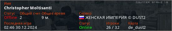 Играет на Counter Strike 1.6 сервере. Страна: РоссияПервый раз замечен 02:24 30.12.2024