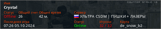 Играет на Counter Strike 1.6 сервере. Страна: РоссияПервый раз замечен 01:22 31.08.2024